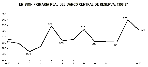 En agosto de 1997, la emisión primaria registró un saldo de 322 millones de nuevos soles de agosto de 1990, reduciéndose en 5,3% en relación al nivel registrado a fines de julio del presente año. Este resultado se explica por la menor afluencia de circulante, que en términos reales disminuyó 4,4% y de las reservas bancarias en 9,4%. Asimismo, se explicó por la disminución de los factores de origen interno en 269 millones de nuevos soles, atenuado parcialmente por una expansión de las operaciones cambiarias en 73 millones de nuevos soles.