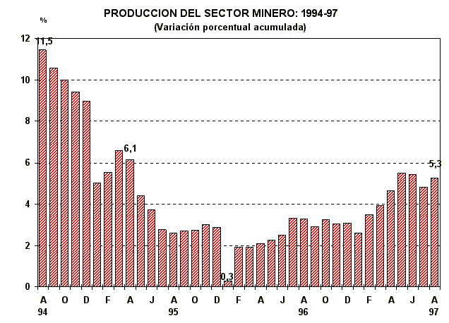 Durante el mes de agosto de 1997, el sector minero experimentó un crecimiento de 8,2%, en relación a similar mes de 1996. Este resultado es explicado por los mayores niveles de producción de todos los minerales metálicos.