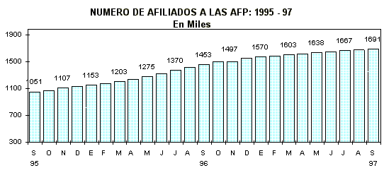La Recaudación mensual en Agosto de 1997 de la SAFP, ascendió a 134 millones 575 mil nuevos soles, siendo la AFP Integra la que registró mayor recaudación con un nivel de 40 millones 75 mil nuevos soles, AFP Unión lo hizo con 30 millones 857 mil nuevos soles, Horizonte 30 millones 505 mil nuevos soles. La menor Recaudación la experimentó AFP Profuturo con 12 millones 219 mil nuevos soles.