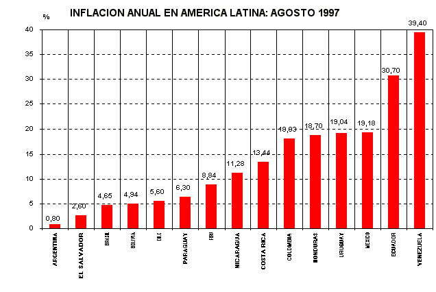 La inflación del octavo mes del año fue de 0,77%, la tasa más baja registrada en la presente década. En el período enero-agosto de 1997 la variación del índice general de precios fue de 11,59% y a doce meses alcanzó a 19,04% según informó el Instituto Nacional de Estadística (INE).