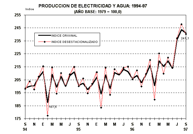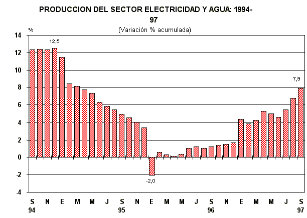 Entre enero y setiembre de 1997, el sector Electricidad y Agua aumentó en 7,9%, la generación eléctrica de servicio público en 9,6%, mientras que la producción de agua potable en Lima Metropolitana disminuyó en -9,9%.