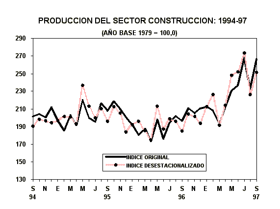 La actividad constructora del país, en el mes de setiembre de 1997, registró un crecimiento de 35,8%, con respecto a similar mes del año pasado, debido al mayor dinamismo que muestran las obras de rehabilitación de caminos rurales, caminos secundarios, la construcción de la carretera Pisco - Ayacucho y los avance de la construcción de diversos tramos de los circuitos viales norte, centro y sur del país. Así como la construcción de hoteles, viviendas y grandes centros comerciales, por parte del sector privado y la autoconstrucción de viviendas.