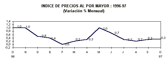 Indice de Precios al por Mayor, experimentó una tasa de crecimiento promedio de 0,34%. La variación acumulada en el período enero- octubre de 1997 es de sólo 3,75%. En términos anualizados, es decir noviembre 1996 y octubre de 1997, el incremento de precios fue de 5,33%.