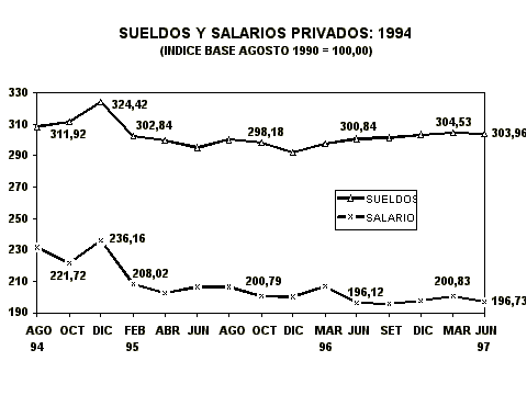 En el mes de junio de 1997 el sueldo promedio mensual (Ejecutivos más Empleados) de la actividad privada se situó en S./ 2027.30, en el caso de obreros el salario promedio diario fue de S/. 25,26, según resultado trimestral de la Encuesta que realiza el INEI en convenio con el Ministerio de Trabajo y Promoción Social.