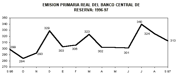 En setiembre de 1997, la emisión primaria registró un saldo de 313 millones de nuevos soles de agosto de 1990, reduciéndose en 3,4% en relación al nivel registrado a fines de agosto del presente año. Este resultado se explicó por la menor afluencia de circulante, que en términos reales disminuyó 4,9%.