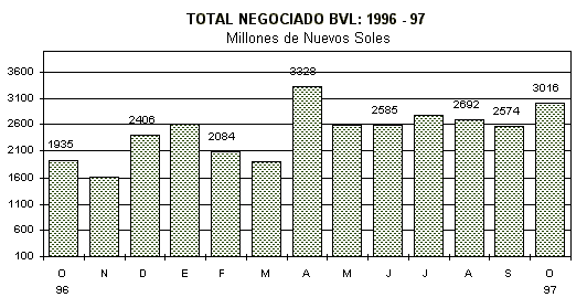 El volumen negociado en Octubre de 1997 en la Rueda de Bolsa, ascendió a 1 mil 523 millones de nuevos soles, superior al monto negociado en el mes de Setiembre (S/.1440,8 millones). En Acciones se transaron 881 millones de nuevos soles, mientras que las Operaciones de Reporte sumaron 497 millones de nuevos soles.