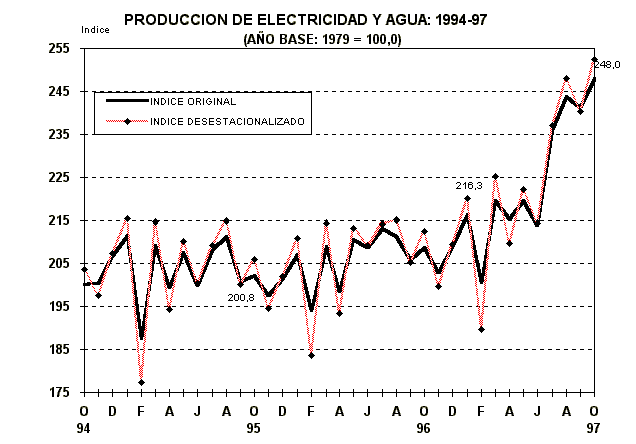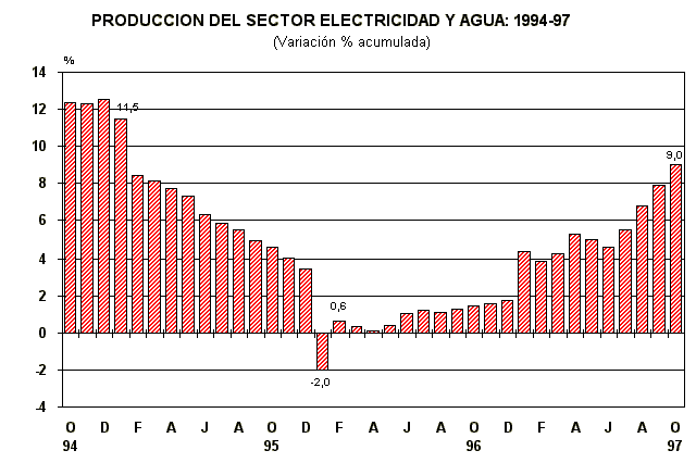 Entre enero y octubre de 1997, el sector Electricidad y Agua aumentó en 9,0%, la generación eléctrica de servicio público en 10,7%, mientras que la producción de agua potable en Lima Metropolitana disminuyó en -9,2%.