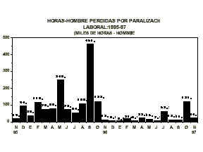 Durante el mes de noviembre de 1997, el número de huelgas fue menor al del mes anterior, se registraron 3 huelgas, con la participación de 293 trabajadores, y generando una pérdida de 24 mil 080 horas-hombre.