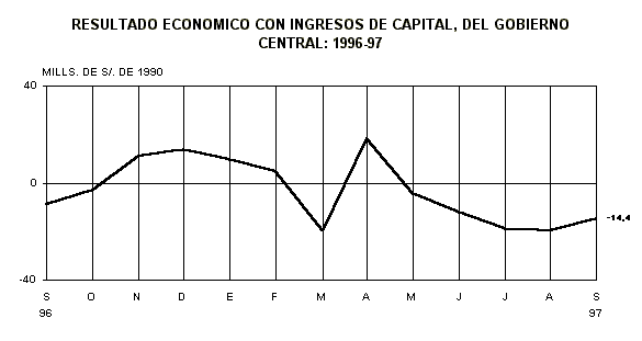 Durante enero-setiembre de 1997, las Operaciones del Gobierno Central, sin considerar Ingresos de Capital, mostraron un Resultado Económico negativo de 88 millones de nuevos soles constantes. Así mismo, el Resultado Económico, incluido el Ingreso de Capital registrado, ascendió a -55 millones de nuevos soles de 1990, evidenciando una disminución de -128,5%, frente al superávit registrado en igual período del año pasado.