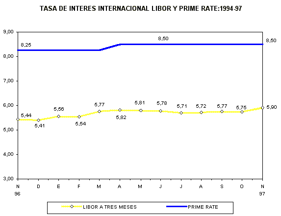 Debido a ello la tasa de interés Prime Rate se mantuvo en el nivel de 8,50%, en tanto que la Libor a tres meses registró una ligera alza de 5,90% a 5,75%%.