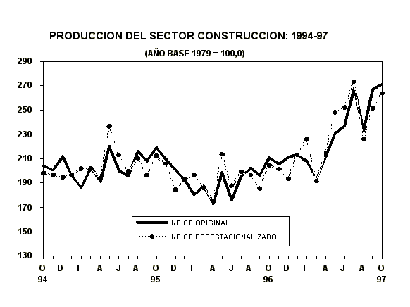 Durante el mes de octubre de 1997, la actividad constructora del país alcanzó un crecimiento de 28,8%, con respecto a similar mes de 1996, debido al sostenido dinamismo que muestran las obras de rehabilitación de caminos rurales, caminos secundarios, la construcción de las carreteras Pisco - Ayacucho, la carretera Transoceánica Ilo - Desaguadero y las obras que se desarrollan para prevenir los efectos del Fenómeno de El Niño, especialmente los trabajos de drenaje y defensa de carreteras. Igualmente en la construcción de hoteles, viviendas y grandes centros comerciales por parte del sector privado y la autoconstrucción de viviendas.