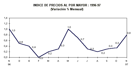 Indice de Precios al por Mayor, experimentó una tasa de crecimiento promedio de 0,80%. La variación acumulada en el período enero-noviembre de 1997 es de sólo 4,59%. En términos anualizados, es decir diciembre 1996 y noviembre de 1997, el incremento de precios fue de 5,16%.