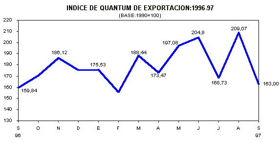 El índice de quántum de las exportaciones en setiembre de 1997, se situó en 163,0, mostrando una disminución de 22,0%, respecto al volumen exportado en el mes anterior. Este resultado se explica por los menores volúmenes embarcados de la mayoría de los productos, excepto aceite de pescado, azúcar y hierro.