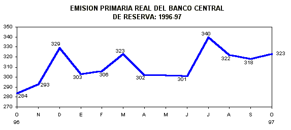En octubre de 1997, la emisión primaria registró un saldo de 4 mil 158 millones de nuevos soles, que en términos constantes significa un incremento de 1,6%, en relación al nivel registrado a fines de setiembre del presente año. Este resultado se explicó, por la mayor afluencia real del circulante en 4,0%.