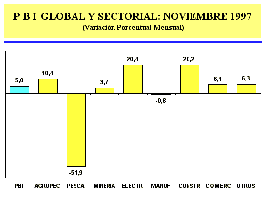 El dinamismo que muestra la producción nacional en los primeros 11 meses de 1997, es debido a que todos los sectores productivos registraron resultados positivos, aunque es importante destacar que son tres los sectores que han experimentado tasas de crecimiento superiores al PBI Global. El sector Construcción con 21,4%, se mantiene como el más dinámico de los sectores, ante la fuerte expansión de la construcción y rehabilitación de carreteras, caminos rurales, viviendas y grandes centros comerciales, así como los trabajos de prevención de los efectos del fenómeno del Niño. El sector Electricidad y Agua creció en 10,0%, principalmente por la mayor generación de energía eléctrica (11,7%). La Actividad Comercial mejoró en 7,9%, por el mayor ingreso de bienes nacionales e importados a los diferentes canales de comercialización mayorista y minorista. La Manufactura aumentó en 7,5%, debido al incremento en la elaboración de bienes de consumo, bienes intermedios y de capital. En menor medida crecieron los sectores, Minería (5,3%) y Agropecuario (4,3%).