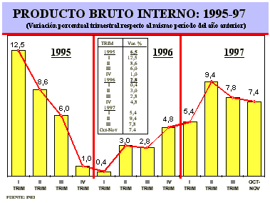 La evolución trimestral de la producción nacional después de haber experimentado cierta desaceleración de su actividad productiva en los últimos trimestres de 1995 y primer trimestre de 1996, registra una recuperación a partir del segundo trimestre de 1996. Alcanzando una alta tasa de crecimiento en el segundo trimestre de 1997 con un promedio de 9,4%, para registrar en el tercer trimestre de 1997, un crecimiento de 7,8%, e iniciando el último trimestre, con un incremento de 7,4% para los meses de octubre y noviembre.