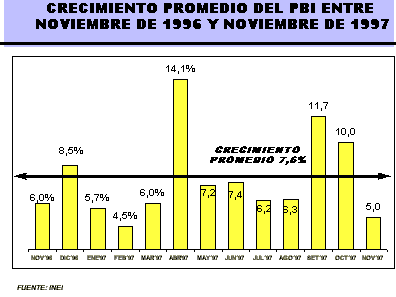 Desde noviembre del año 1996, la economía nacional viene registrando tasas positivas de crecimiento, que se mantuvieron durante 1997, alcanzando entre noviembre de 1996 y noviembre de 1997, un ritmo de crecimiento promedio mensual de 7,6%.