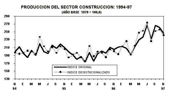 La actividad constructora del país, en el mes de noviembre de 1997, alcanzó un crecimiento de 20,2%, con respecto a similar mes de 1996, debido al dinamismo que muestran las obras de rehabilitación de caminos rurales, caminos secundarios, la construcción de las carreteras Pisco - Ayacucho, la carretera Transoceánica Ilo - Desaguadero y las obras que se desarrollan para prevenir los efectos del fenómeno del Niño, especialmente los trabajos de drenaje y defensa de carreteras. Igualmente en la construcción de hoteles, viviendas y grandes centros comerciales, a través del sector privado y la autoconstrucción de viviendas.