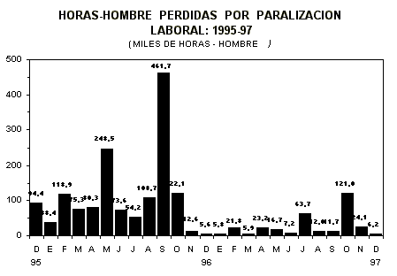 Durante el mes de diciembre de 1997, el número de huelgas fue igual al del mes anterior, se registraron 3 huelgas, con la participación de 153 trabajadores, lo que generó una pérdida de 6 mil 242 horas-hombre.