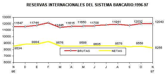 Al cierre de noviembre de 1997, las reservas internacionales brutas (RIB) del sistema bancario, ascendieron a 12 mil 43 millones de dólares, incrementándose en 11 millones de dólares con relación al mes de octubre. Este resultado se explicó por el incremento de los activos internacionales del BCRP en 37 millones de dólares, siendo parcialmente atenuado por una reducción de los correspondientes al resto del sistema en 26 millones de dólares. Este aumento de divisas en el BCRP, se sustentó por los mayores aportes a los organismos internacionales en 226 millones de dólares.