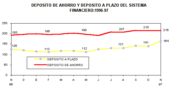 En comparación a noviembre de 1996, el ahorro financiero total creció en 12,8%, tanto por los depósitos en moneda extranjera, que aumentaron en 6,6%, como en moneda nacional que crecieron en 32,3%.