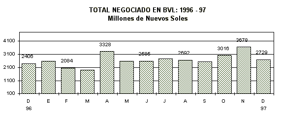 El volumen negociado en diciembre de 1997 en la Rueda de Bolsa, ascendió a 1 mil 680 millones de nuevos soles, inferior al monto negociado en el mes de noviembre (S/.1979,8 millones). En Acciones se transaron 1 mil 83 millones de nuevos soles, mientras que las Operaciones de Reporte sumaron 365 millones de nuevos soles.