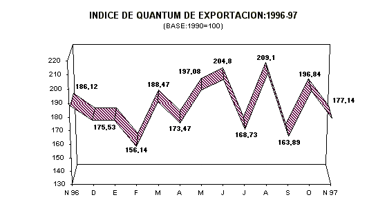 El índice de quántum de las exportaciones en noviembre de 1997, se situó en 177,14, mostrando un caída de 10,0%, respecto al volumen exportado en el mes anterior. Este resultado se explica por los menores volúmenes embarcados de algodón, café, cobre, estaño, plomo, zinc y petróleo.
