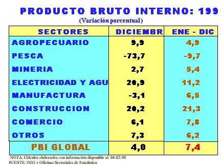 La producción nacional desde 1993, viene experimentando una notable y sostenida recuperación alcanzando a 1997 un crecimiento acumulado de 41,9%, revertiendo la caída de -23,4%, en el PBI entre 1988 y 1992. El incremento de la producción en 7,4%, en el año 1997, confirmó como el quinto año consecutivo de crecimiento que registra la economía peruana, y que ubica al Perú como uno de los países con mayor crecimiento productivo en América Latina.