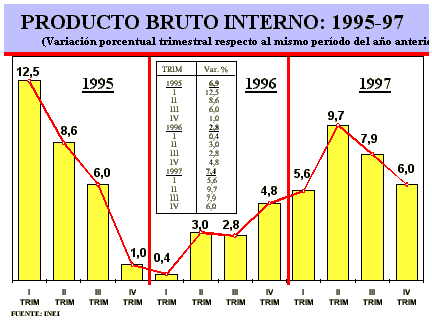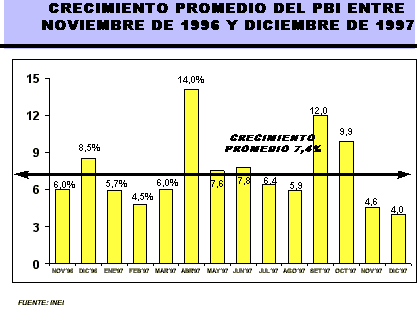 Desde noviembre del año 1996, la economía nacional viene registrando tasas positivas de crecimiento, que se mantuvieron durante 1997, alcanzando entre noviembre de 1996 y diciembre de 1997, un ritmo de crecimiento promedio mensual de 7,4%.