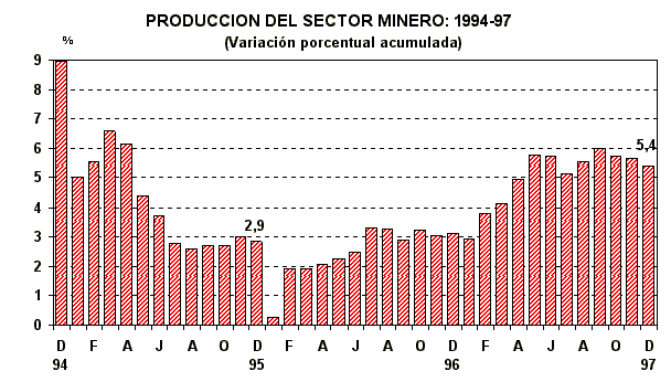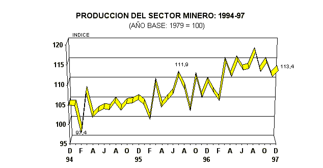 Durante 1997, el sector minero creció en 5,4%, en relación a 1996. Este resultado es explicado por los mayores volúmenes de producción de los minerales metálicos.