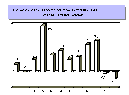 En el mes de diciembre de 1997, la producción manufacturera decreció en -3,1%, respecto a igual mes de 1996. El incremento de los Bienes de Consumo (3,1%) y de los Bienes de Capital (22,2%), no lograron revertir la caída en la fabricación de Bienes Intermedios en -11,3%.