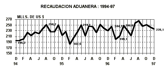 La Recaudación Aduanera en diciembre de 1997, registró 235 millones 100 mil dólares, que en moneda nacional se traducen en 639 millones 100 mil nuevos soles, observando un incremento de 2,7% en relación al registrado en diciembre de 1996.