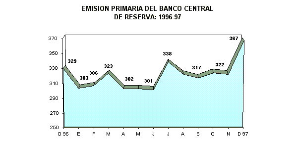 Al 31 de diciembre de 1997, la emisión primaria registró un saldo de 4 mil 761 millones de nuevos soles, que en términos constantes significa una expansión de 14,0%, en relación al nivel registrado a fines de noviembre. Este resultado se explicó, como resultado de la mayor demanda por circulante durante las fiestas de fin de año (14,3%).