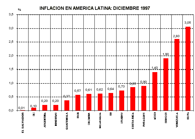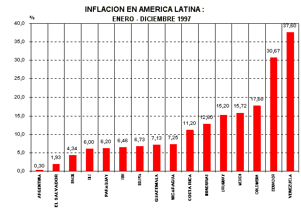La inflación siguió reduciéndose en América Latina, el promedio de la región ascendió a 10,4%, inferior en 8,5 puntos porcentuales a lo obtenido en 1996 y el más bajo en 50 años. De los países analizados sólo Ecuador y Argentina registraron tasas superiores a las de 1996. En Argentina los precios al consumidor subieron en 0,05% en 1996, mientras que en 1997 éstos subieron ligeramente en 0,30%, registrando nuevamente la menor inflación en América Latina. En Ecuador se registró un incremento de más de 5,1 puntos porcentuales respecto a 1996.