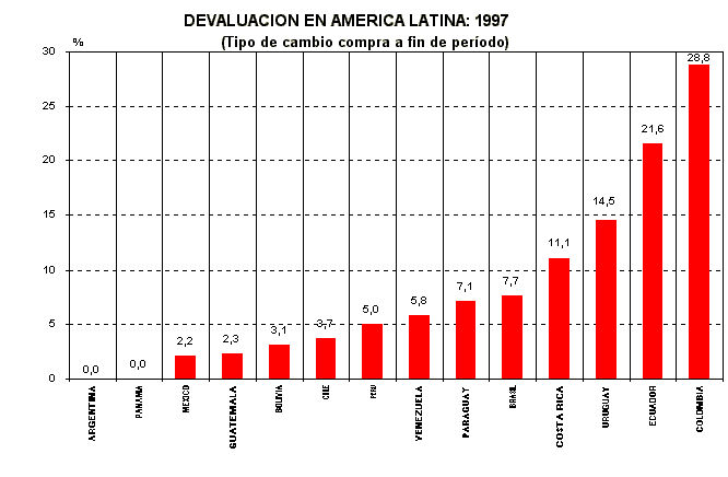 La recuperación económica en América Latina se acentuó en 1997, el crecimiento promedio del Producto Bruto Interno - con información de 16 países - fue de 5,0%, mientras que la inflación promedio de la región alcanzó la tasa de 10,4%. Estas cifras macroeconómicos anuales fueron los mejores registradas desde hace varias décadas.