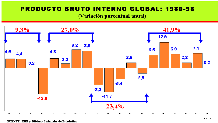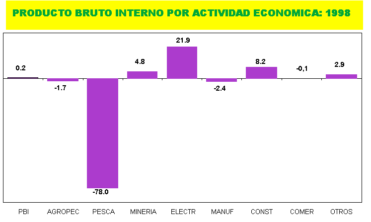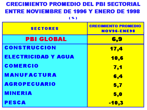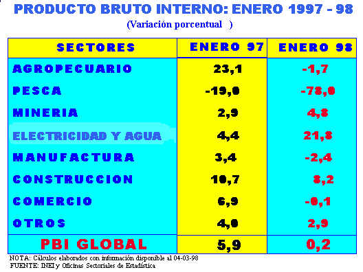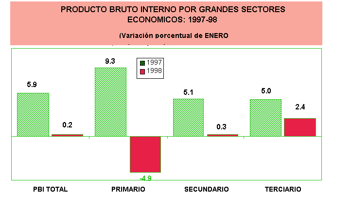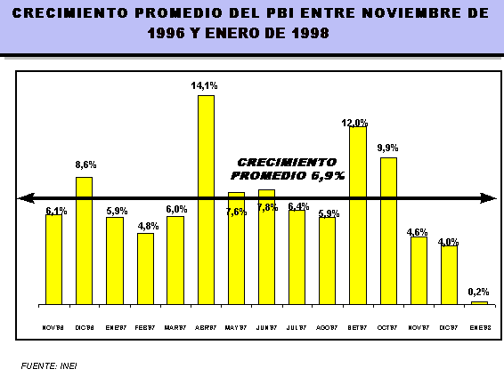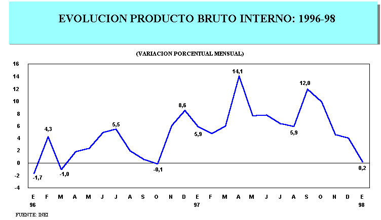 Desde noviembre del año 1996, la economía nacional viene registrando tasas positivas de crecimiento, que se mantuvieron durante 1997 y enero 1998, alcanzando entre noviembre de 1996 y enero de 1998, un ritmo de crecimiento promedio mensual de 6,9%. Sin embargo, entre setiembre del 97 y enero del 98, la tendencia es decreciente, alcanzando en el último mes un ligero incremento de 0,2%.