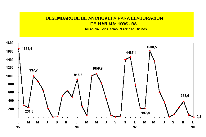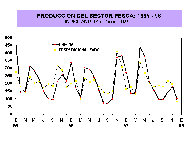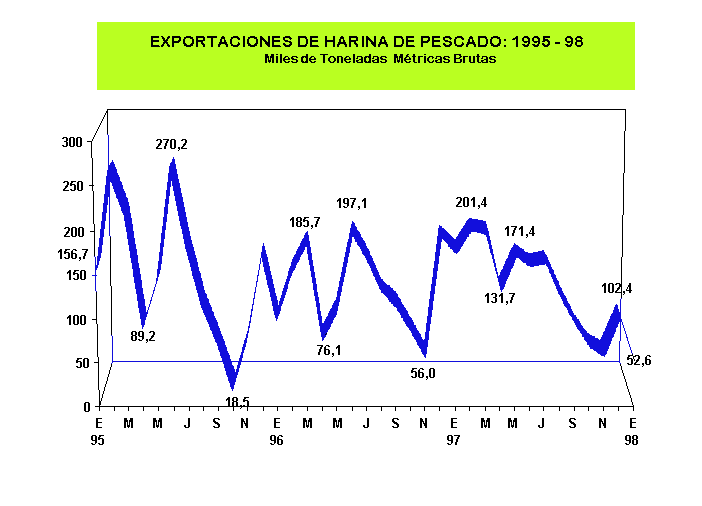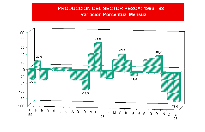 La actividad pesquera durante enero de 1998, experimentó una disminución de -78,0%, con respecto a similar mes del año pasado. Este comportamiento es explicado por la continuidad de las alteraciones climatológicas originadas por la presencia del Fenómeno del Niño, impactando negativamente en la actividad pesquera, al causar el alejamiento de las especies marítimas de la Costa, afectando los niveles de captura, especialmente de las especies destinadas a la industria de harina y aceite de pescado.