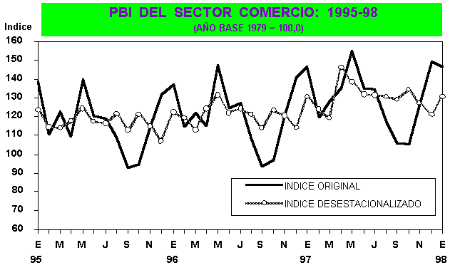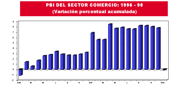 La actividad comercial, en el mes de enero de 1998 registró un leve decrecimiento de -0,1%, con respecto al nivel alcanzado en similar mes de 1997, originado por la menor oferta de productos nacionales en los diversos circuitos comerciales del país ante la disminución en la producción de los sectores agropecuario (-1.7%), pesca (-78,0%), manufactura (-2,4%), no obstante el crecimiento registrado en la minería (4,8%) y construcción (8,2%).