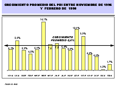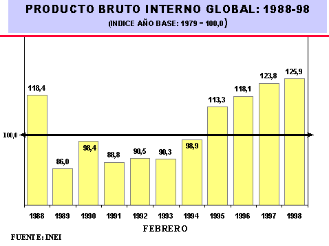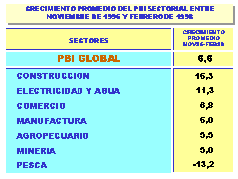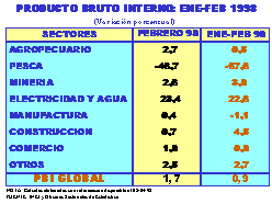 A nivel sectorial, la actividad Agropecuaria experimentó una recuperación de 2,7%, debido principalmente al incremento de la producción del subsector agrícola en 3,0%, y el pecuario en 2,2%, el cual mantiene su comportamiento positivo desde enero de 1997. Entre los productos pecuarios destacan en este mes, la mayor producción de carne de ovino en 5,9%, vacuno 2,4%, porcino 2,9%, huevos 13,3% y leche fresca en 1,6%. Asimismo, los productos agrícolas que registraron incremento en su producción fueron: arroz cáscara 22,9%, cebolla 4,6%, papa 43,1%, maíz amiláceo 12,9%, café 77,8%, limón 25,5% y plátano 5,3%, entre los principales. La actividad Pesquera, experimentó una caída de -46,7%. La pesca marítima disminuyó en -49,2% comportamiento explicado básicamente por la fuerte reducción en los niveles de captura de anchoveta, ante el alejamiento de esta especie de nuestras costas por las altas temperaturas del mar, como efecto del Fenómeno de El Niño. Sin embargo, es importante indicar que las últimas investigaciones de IMARPE, señalan la presencia de cardúmenes de anchoveta que estaría posibilitando la normalización de su captura para mediados de abril. La Minería se incrementó en 2,6%, debido a la mayor producción de los productos minero metálicos en 4,5%, destacando los mayores niveles de producción del Oro en 21,5%, Hierro 29,4%, y Plomo 2,5%. Contrariamente disminuyeron el Cobre (-7,9%), Plata (-0,3%), y Zinc (-3,9%). Asimismo, los niveles de extracción de petróleo se redujeron en -1,8%. La Industria Manufacturera, en febrero registró un ligero incremento de 0,4%. Las industrias del sector manufacturero no primario (excluyendo las industrias de transformación de pescado, refinería de petróleo y metálicas no ferrosas), crecieron en 1,5%. Las industrias productoras de bienes intermedios, aumentaron en 5,0%, debido a la mayor producción de Sustancias Químicas en 31,4% y Minerales no Metálicos 22,6%. Los bienes de capital se incrementaron en 6,1%.Contrariamente, las industrias procesadoras de bienes de consumo disminuyeron en -6,2%. De otro lado, es importante destacar los incrementos obtenidos por la Industria de Bebidas (5,8%), Sustancias Químicas (31,4%), Tabaco 38,9%, objetos de Loza y Porcelana 18,1%, Metálicas Simples (8,1%) y Maquinaria No Eléctrica (31,4%), entre los principales. La Actividad Constructora, creció en 0,7%, aunque mostrando una desaceleración en su dinámica, respecto a meses anteriores. Los despachos de cemento se incrementaron en 3,5%. El ritmo de la construcción y rehabilitación de carreteras y caminos rurales, se vieron afectados por el Fenómeno de El Niño. La Actividad Comercial se incrementó en 1,8%, por el mayor ingreso de algunos productos agrícolas, pesqueros, industriales a los diferentes canales de comercialización interna, es importante indicar que durante el mes de febrero se ha registrado una mayor oferta de productos importados.