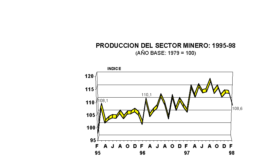 Durante febrero de 1998, el sector minero creció en 2,6%, en relación a similar mes del año pasado. Este resultado es explicado por los mayores volúmenes de extracción de hierro y oro.
