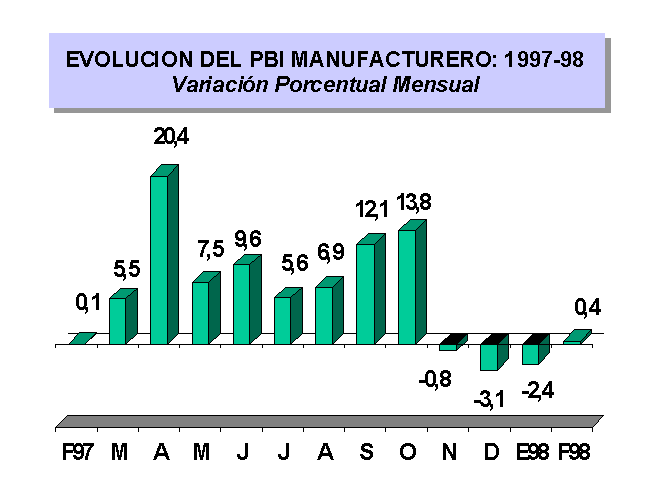 En los dos primeros meses de 1998, la industria manufacturera registró una producción acumulada de -1,1%, como resultado del comportamiento desfavorable mostrado por las Industrias de Producción de Bienes de Consumo (-5,2%) y de Bienes Intermedios (-0,2%), no obstante, el incremento alcanzado por las Industrias dedicadas a la fabricación de Bienes de Capital que crecieron en 11,8%, para el periodo.