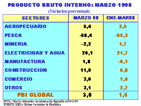 A nivel de sectores productivos se registró el siguiente comportamiento: la producción agropecuaria experimentó un crecimiento de 5,4%, explicado por los mayores volúmenes registrados de productos agrícolas (5,3%), destacando los incrementos del frijol grano seco 19,2%, maíz amiláceo 40,3%, papa 57,8%, cebolla 24,7%, yuca 30,9%, algodón rama 34,0%, café 44,7%, entre los principales. La producción pecuaria se incrementó en 5,6%, destacando el aumento de la carne de ovino 5,9%, porcino 2,9%, vacuno 6,9%, huevos 15,7% y leche fresca en 3,4%. La Pesca, mantiene su comportamiento negativo al registrar mínimos volúmenes de extracción de anchoveta y sardina, principales especies del sector, en marzo la actividad pesquera disminuyo en -58,4%, respecto a marzo del año pasado, la captura de anchoveta fue de sólo 0,2 miles de TMB, debido a la continuación de la veda, así como, por los efectos del Fenómeno de El Niño que originaron el alejamiento de estas especies de nuestro litoral. La Producción Minera disminuyó en -2,2%, este resultado es determinado por los menores niveles de extracción del petróleo crudo (-12,0%) y de sus metales, cobre, plata, plomo y zinc, comportamiento que es atenuado por los incrementos experimentados por el hierro y el oro. El Sector Manufacturero en marzo creció en 1,8%, respecto a marzo de 1997, debido a la mayor producción de los Bienes Intermedios que se incrementaron en 6,0%, destacando la producción de Sustancias Químicas en 27,6%, Minerales no Metálicos 29,8%, Hierro y Acero 9,1%,Objetos de Loza y Porcelana 22,2% y Refinería de Petróleo 19,4%, entre los principales. Asimismo, la producción de Bienes de Capital se incrementó en 16,6%, determinado por el incremento en la Maquinaria no Eléctrica 103,3%, Metálicas Simples 31,1% y Material de Transporte 15,8%. De otro lado, la Producción de Bienes de Consumo disminuyó en -5,6%. La Actividad Constructora experimentó un crecimiento de 11,9%, registrando una recuperación en el ritmo de su actividad. Los despachos locales de cemento crecieron en 12,4%, en tanto que el avance físico en la construcción de caminos y carreteras ha disminuido su dinamismo, como resultado de los efectos ocasionados por el Fenómeno de El Niño. La Actividad Comercial se expandió en 3,0%, debido a la mayor disponibilidad de bienes nacionales originados por el incremento de la actividad productiva y el aumento de la oferta de bienes importados en los diferentes canales de comercialización nacional.