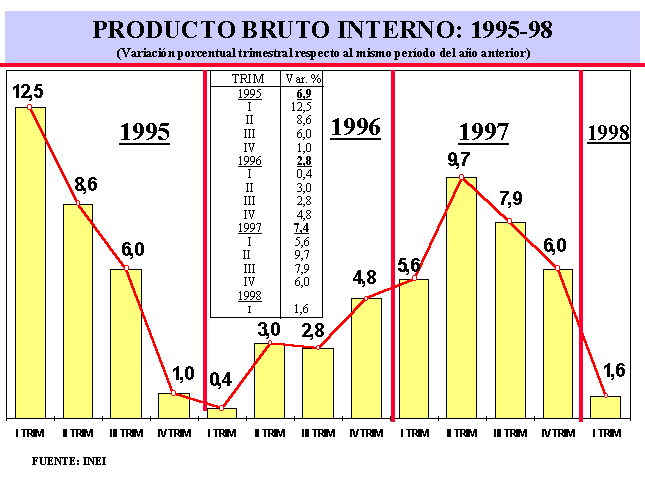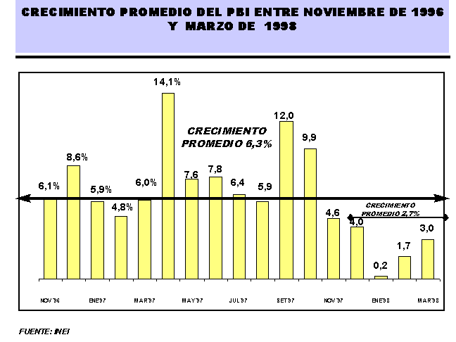 La tendencia trimestral del PBI, luego de experimentar una tendencia decreciente desde el I trimestre de 1995, hasta alcanzar su punto mas bajo en el I trimestre de 1996, inició una recuperación alcanzando el punto mas alto el II trimestre de 1997, para luego experimentar una declinación, afectado por factores como el Fenómeno de El Niño y la Crisis Asiática, que alcanzan su mayor impacto en el primer trimestre de 1998. Sin embargo, es importante indicar que a pesar de los efectos del Fenómeno de El Niño, se ha obtenido un resultado positivo en este I trimestre del presente año, de 1,6%, que nos permitiría cerrar el año favorablemente, considerando el alejamiento del Niño. Desde noviembre del año 1996, la economía nacional viene registrando tasas positivas de crecimiento, que se mantuvieron durante 1997 y enero-marzo 1998, alcanzando entre noviembre de 1996 y marzo de 1998, un ritmo de crecimiento promedio mensual de 6,3%. Entre setiembre del 97 y enero del 98, la tendencia ha sido decreciente. Sin embargo, después de haber alcanzado sólo 0,2% en enero de 1998, se observa una recuperación en los meses de febrero (1,7%) y marzo (3,0%). Cabe indicar que en el periodo de acentuación del Fenómeno de El Niño, noviembre 97-marzo98, el crecimiento promedio de la producción fue de 2,7%. En los últimos diecisiete meses, los sectores económicos que han registrado un mayor dinamismo son, el sector Construcción con un ritmo promedio mensual de 16,0%. Prosiguen, el sector Electricidad y Agua con 11,8%, y la actividad Comercial en 6,5% que registraron tasas de crecimiento, por encima del promedio global del PBI.
