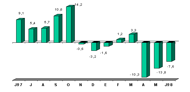 La actividad manufacturera registra en el mes de junio una disminución de -7,6%, respecto al nivel alcanzado en similar mes del año 1997. Este resultado, al igual que en el mes de mayo, refleja principalmente, la menor producción de la Industria de Harina de Pescado (-43,5%), Alimentos, Bebidas y Tabaco (-20,4%), Industria Textil, Confecciones y Cuero (-11,8%), sumándose a éstas tres divisiones la caída en el nivel productivo de la Industria Metálica y Maquinaria en -1,3%, luego de haber mantenido una tendencia ascendente desde el mes de abril de 1997 a mayo de 1998, con crecimientos significativos.