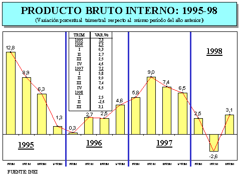 La producción nacional desde el mes de noviembre de 1997, mes que se hizo evidente los primeros efectos del fenómeno de El Niño, hasta el mes de setiembre de 1998, registró un crecimiento promedio mensual de 1,6%.