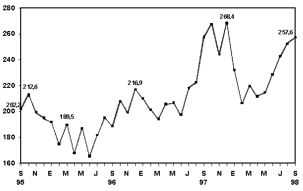 El sector construcción, en el mes de setiembre experimentó una leve disminución de -0,1%, con respecto a similar mes del año anterior. Este comportamiento se explica por el retraso en las obras de rehabilitación y mantenimiento de caminos rurales, al menor ritmo en los trabajos de ejecución del Programa Corredor Vial Interoceánico del Sur, a la menor demanda en los despachos de cemento, que alcanzaron las 396 mil 340 toneladas métricas, cifra solamente superior en 2,7%, al volumen registrado en setiembre de 1997, así como, a la disminución en la demanda por inmuebles. Las empresas cementeras que tuvieron mayores incrementos en sus despachos fueron, Cementos Lima (10,7%) y Cementos Andino (10,6%). Las empresas que registraron menores ventas fueron, Cementos Norte Pacasmayo (-11,7%), Cementos Yura (-0,8%) y Cementos Sur (-17,9%). En setiembre de 1998, el total de obras ejecutadas en la rehabilitación y mantenimiento de caminos rurales alcanzó los 108 km., constituidos por caminos rurales (100 km), caminos secundarios (5 km) y obras de mejoramiento de calles (3 km). La inversión pública realizada para la ejecución de este programa, en el mes de análisis fue de aproximadamente de 2,7 millones de dólares. Las diferentes obras que se vienen realizando, en el marco de la reconstrucción y mejoramiento de carreteras afectadas por el fenómeno de El Niño, que al mes de setiembre tienen un avance de 40%, se esperan concluir hasta fines de año. El inicio de la construcción de la carretera de acceso al yacimiento de Antamina con una inversión de 80 millones de dólares. La meta del programa de concesiones viales, de construir 335 kilómetros de calzadas nuevas, el asfaltado de 606 kilómetros de vías afirmadas, la rehabilitación de 1 mil 300 kilómetros de vías asfaltadas y convertir 491 kilómetros de carreteras en autopistas, así como, el proyecto de SEDAPAL, de construir una nueva planta de tratamiento de aguas servidas, permiten visualizar un comportamiento favorable en el sector, en los siguientes meses. De otro lado, en enero - setiembre del presente año, el sector construcción registró un crecimiento de 7,9%, respecto a similar período del año anterior, sustentado por el mayor nivel en los despachos de cemento (4,6%), la venta de barras de construcción (4,4%) y la rehabilitación de 1 mil 725 km. de caminos rurales. INDICE DEL PBI DEL SECTOR CONSTRUCCION: 1995-98