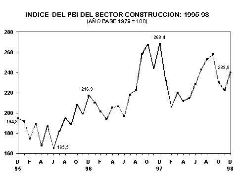 En el período acumulado enero - diciembre de 1998, la actividad constructora experimentó un crecimiento de 2,3%, con respecto a similar período de 1997. Este comportamiento, se sustenta en los mayores niveles de despachos de cemento (0,4%), rehabilitación de caminos rurales (2242 km), rehabilitación de caminos secundarios (362 km), mejoramiento de calles (54 km). Asimismo, la reconstrucción de infraestructura en agricultura, vivienda, salud, educación, carreteras y saneamiento en las diversas zonas del país que fueron afectadas por el fenómeno de El Niño y avance en la construcción de la carretera Ilo - Desaguadero.