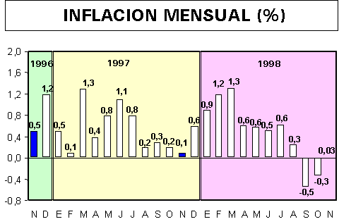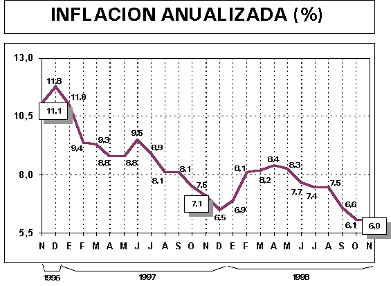 El resultado del mes de noviembre de 0,03% muestra un ligero incremento en el nivel general de los Precios al Consumidor, con respecto a la tendencia observada en los meses de setiembre y octubre, que mostraron una variación negativa de -0,54% y -0,33%, respectivamente, lo cual es atribuible al aumento registrado en algunos productos alimenticios que en los meses anteriores tuvieron una disminución en sus precios. El comportamiento mensual de la inflación durante 1998 registra cuatro etapas. La primera, determinada principalmente por los efectos del Fenómeno de El Niño, corresponde al primer trimestre del año, en la cual la inflación promedio mensual es de 1,2%. La segunda etapa, que va de abril a julio, la inflación promedio mensual se ubica alrededor del 0,6%, debido a la disminución de los efectos del Fenómeno de El Niño. La tercera etapa, se inicia en agosto en que la inflación es de 0,26%, como consecuencia de la normalización del abastecimiento de los productos alimenticios y continúa en los meses de setiembre y octubre con una variación negativa de -0,54% y -0,33%, respectivamente. La cuarta etapa se inicia en el mes de noviembre, con un incremento de 0,03% y refleja la estabilidad en los niveles de precios de los bienes y servicios que conforman la Canasta Familiar. La inflación de noviembre de 1998 de 0,03% es inferior en 5 centésimos a la de noviembre de 1997 que fue de 0,08%. En 1996, la inflación mensual de noviembre fue de 0,47%, en 1995 fue de 1,24% y en 1994 de 1,22%. TENDENCIA DE LA INFLACION La tasa de inflación promedio mensual del periodo enero - noviembre de 1998, alcanza una velocidad de 0,48%, cifra que es menor en 0,03 centésimos a la registrada para el similar período en 1997, cuyo promedio inflacionario mensual fue de 0,51%. Al analizar comparativamente la inflación acumulada del período enero – noviembre de este año (5,35%), con respecto a similar período en 1997 (5,79%), se observa que es menor en 0,44 puntos porcentuales, no obstante que la inflación acumulada de este año está influenciada por los efectos del Fenómeno de El Niño en los niveles de precios. Al comparar con los años anteriores, la inflación acumulada de 1998 es casi la mitad a la de 1996 (10,51%), a la del 95 (9,65%) y la del 94 (14,71%). La inflación anualizada al mes de noviembre llega a 6,03%. De esta manera, por tercer mes consecutivo, la inflación anualizada se ubica alrededor del 6% Como efecto del Fenómeno de El Niño la inflación anualizada de febrero a mayo fue ligeramente superior al 8,0%. En los meses de junio, julio y agosto, la inflación anualizada se mantuvo en más del 7% y en setiembre, octubre y noviembre es menor al 7,0%.