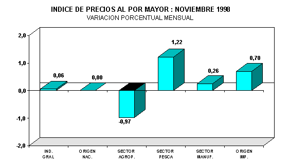 El Indice de Precios al por Mayor a Nivel Nacional (IPM), en noviembre fue 1574,18, registrando una variación mensual de 0,06%. La variación acumulada en lo que va del año es de 6,42% y la variación anual es 6,88%. En noviembre, los productos nacionales mantuvieron en promedio los niveles de precios del mes anterior y los importados registraron una ligera alza de 0,70%. Analizando las variaciones por sectores, tanto los bienes agropecuarios como los manufacturados de uno y otro origen, mostraron la misma tendencia: los agropecuarios nacionales bajaron -0,97% y los agropecuarios importados -1,45%, los manufacturados nacionales subieron 0,26% y los manufacturados importados 0,97%. Los precios de las especies marítimas subieron en promedio 1,22%..