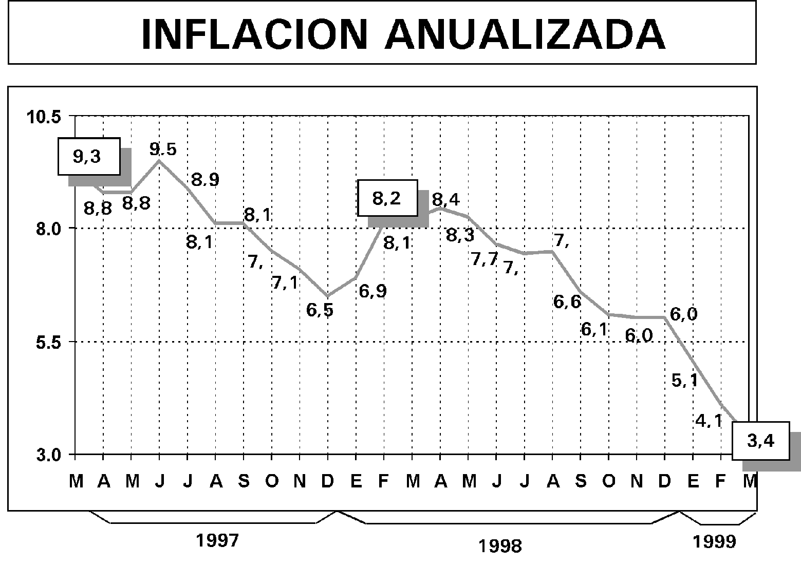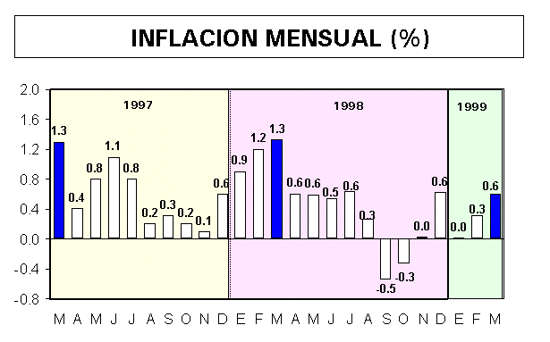 Al comparar el índice inflacionario de marzo de 1999, con respecto a la inflación registrada en el mes de febrero de este mismo año, que fue de 0,31%, ésta es mayor en 3 décimos. La variación observada en el mes de marzo, tiene un fuerte componente estacional que se refleja en las alzas registradas en Alimentos y Bebidas (0,4%) y los gastos que realizan los hogares al inicio del año escolar en Servicio de Enseñanza y Cultura (3,0%). Se aprecia que el resultado de marzo (0,61%) constituye la tasa mensual más alta del presente año. En enero, la inflación aumentó en 0,01% y en febrero subió en 0,31%. Sin embargo, al compararla con la inflación de marzo de 1998, que fue de 1,32% y que estuvo fuertemente influenciada por los efectos del Fenómeno de El Niño, se observa que la inflación de marzo de 1999 es menor en 0,71 décimos. Asimismo, es menor a la inflación de marzo de los años 1997 (1,27%), de 1996 (1,38%), de 1995 (1,37%) y de 1994 (2,32%). Al comparar la serie histórica de los resultados inflacionarios del mes de marzo, se observa que con la inflación de este marzo (0,61%), se retorna a la inflación menor al 1%, que no se registraba desde marzo de 1971, en que fue de 0,77%. A partir de 1972 hasta 1998, la inflación del mes de marzo siempre ha sido mayor al 1%.